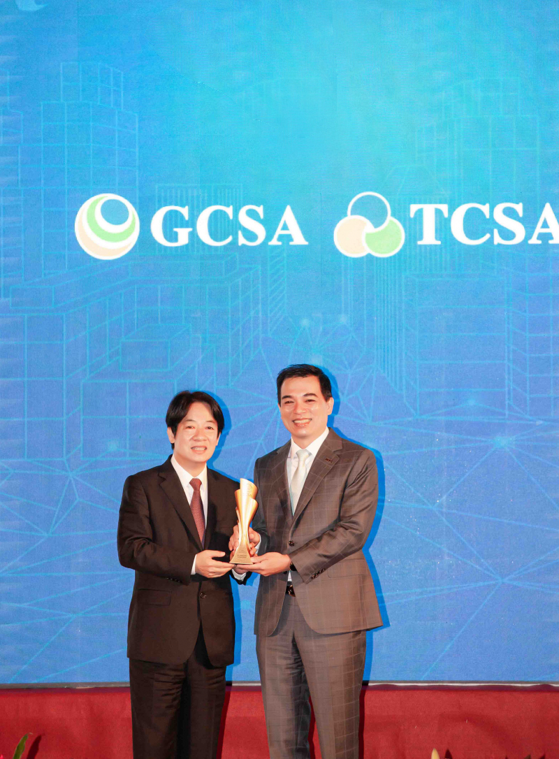 达全方位永续表现获全球永续奖及台湾永续奖肯定,由副总统赖清德颁奖 (左),k1体育总经理柯富仁 (右) 代表领奖