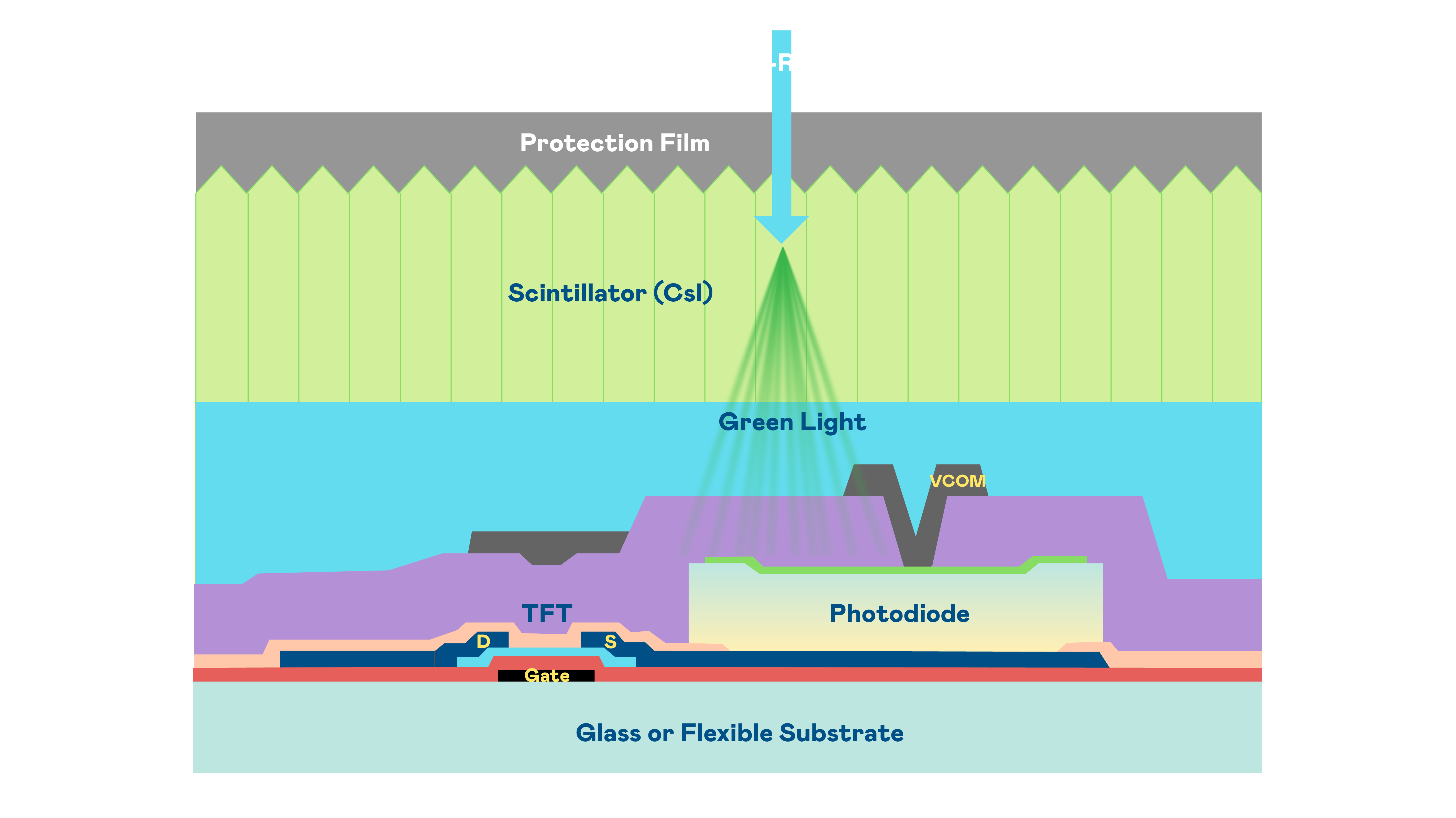 友達的X光影像感測陣列使用薄膜電晶體 (TFT) 作為每個像素的讀取開關,搭配光電二極體(Photodiode)的光電轉換元件,用以感測X光影像訊號。